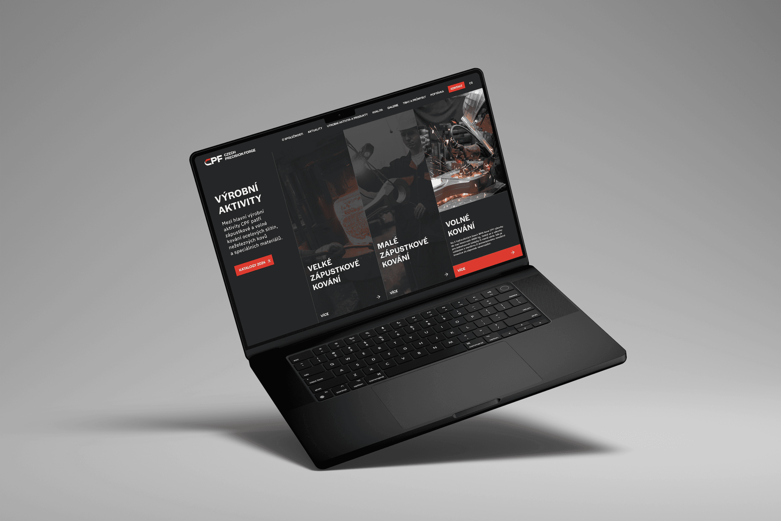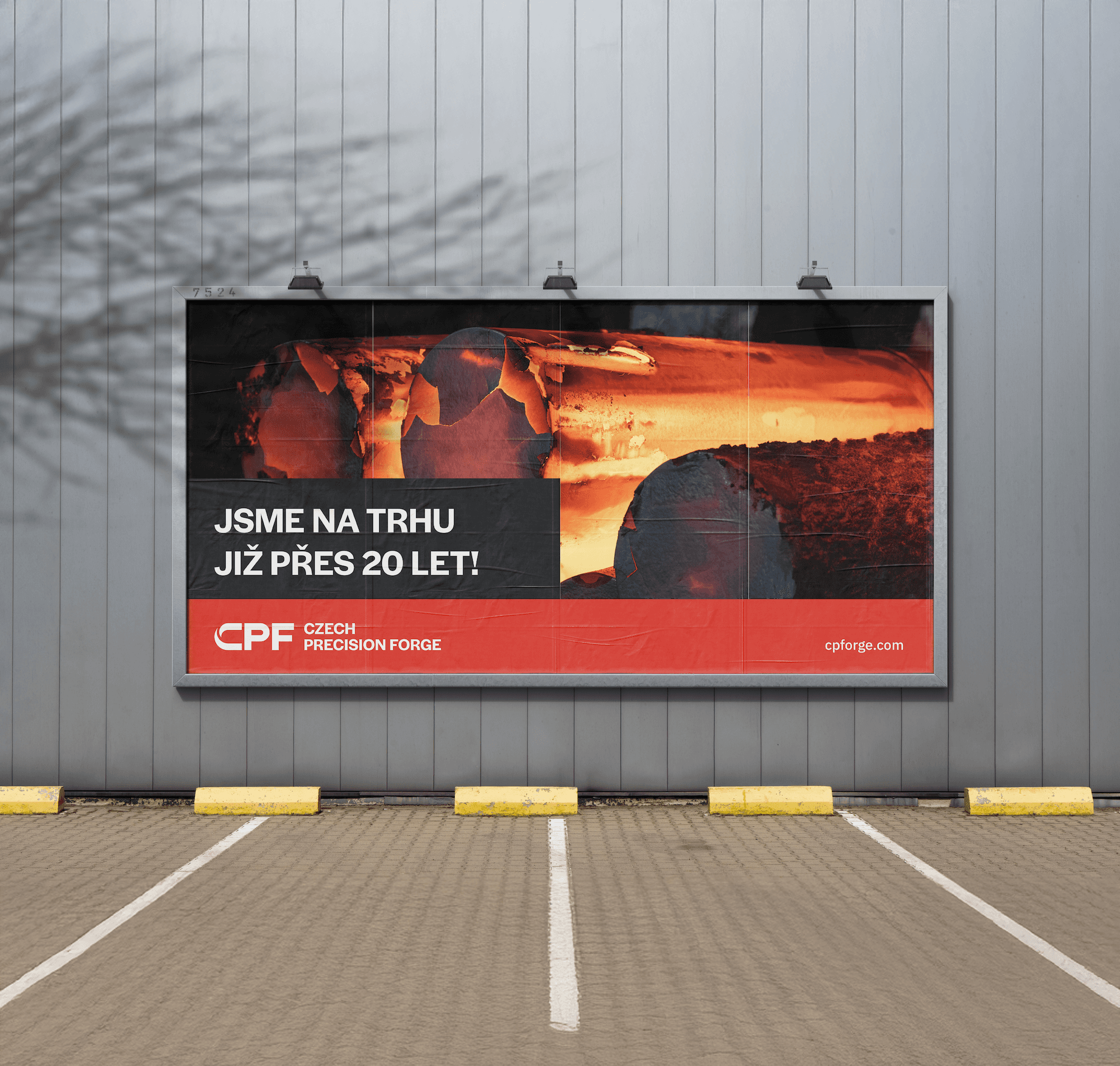 Nová vizuální identita společnosti Czech Precision Forge není jen estetickou úpravou, je hlubokým odrazem fyzikální podstaty samotného kování. Celý koncept vychází z fascinujícího momentu, kdy se masivní buchar setkává s rozžhaveným kovem. Tento okamžik nekompromisního dopadu energie definuje charakter firmy, což se v identitě projevuje využitím masivních tvarů, dynamikou pohybu a pocitem průmyslové dominance a stability. Aby identita neevokovala pouze hrubou sílu těžkého průmyslu, je klíčovým prvkem integrace technických výkresů. Ty do vizuálu vnášejí potřebný řád a připomínají, že srdcem CPF je precizní inženýrství s přesností na milimetry. Jemné linie výkresů se objevují v podobě rastrů na pozadí nebo jako doplňkové grafické detaily, kde vytvářejí elegantní kontrast k plochám sytých barev. Tento prvek symbolizuje cestu od prvotního návrhu až po finální, technicky dokonalý výkovek.