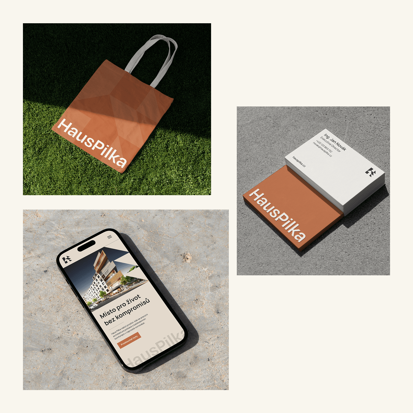 Rozsah a síla vizuální identity Haus Pilka byly ověřeny na sérii konkrétních aplikací napříč celým projektem. Návrh ukazuje, jak se vizuální jazyk promítá do digitální prezentace domu, prodejních a informačních materiálů i do samotného fyzického prostředí stavby. Identita se tak nestává pouze grafickým prvkem, ale přirozenou součástí architektury, orientace v prostoru a celkového vnímání projektu. Tento přístup demonstruje, jak může vizuální identita dlouhodobě podporovat charakter domu a jeho hodnotu.